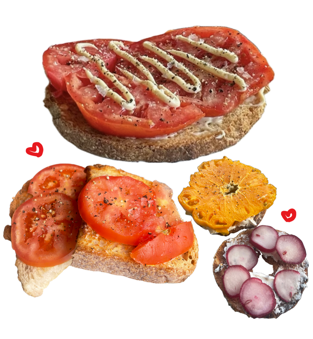 originating in virginia in the early 1900s, tomato sandwiches are top tier southern cuisine. it tastes like summer, with that giant slab of tomato covered in flaky salt and pepper and creaminess. i do bend the rules a little bit and use sourdough instead of regular white bread for more texture and kewpie mayo instead of duke's for that sweet sweet msg. all in all tastes better bless the lord.