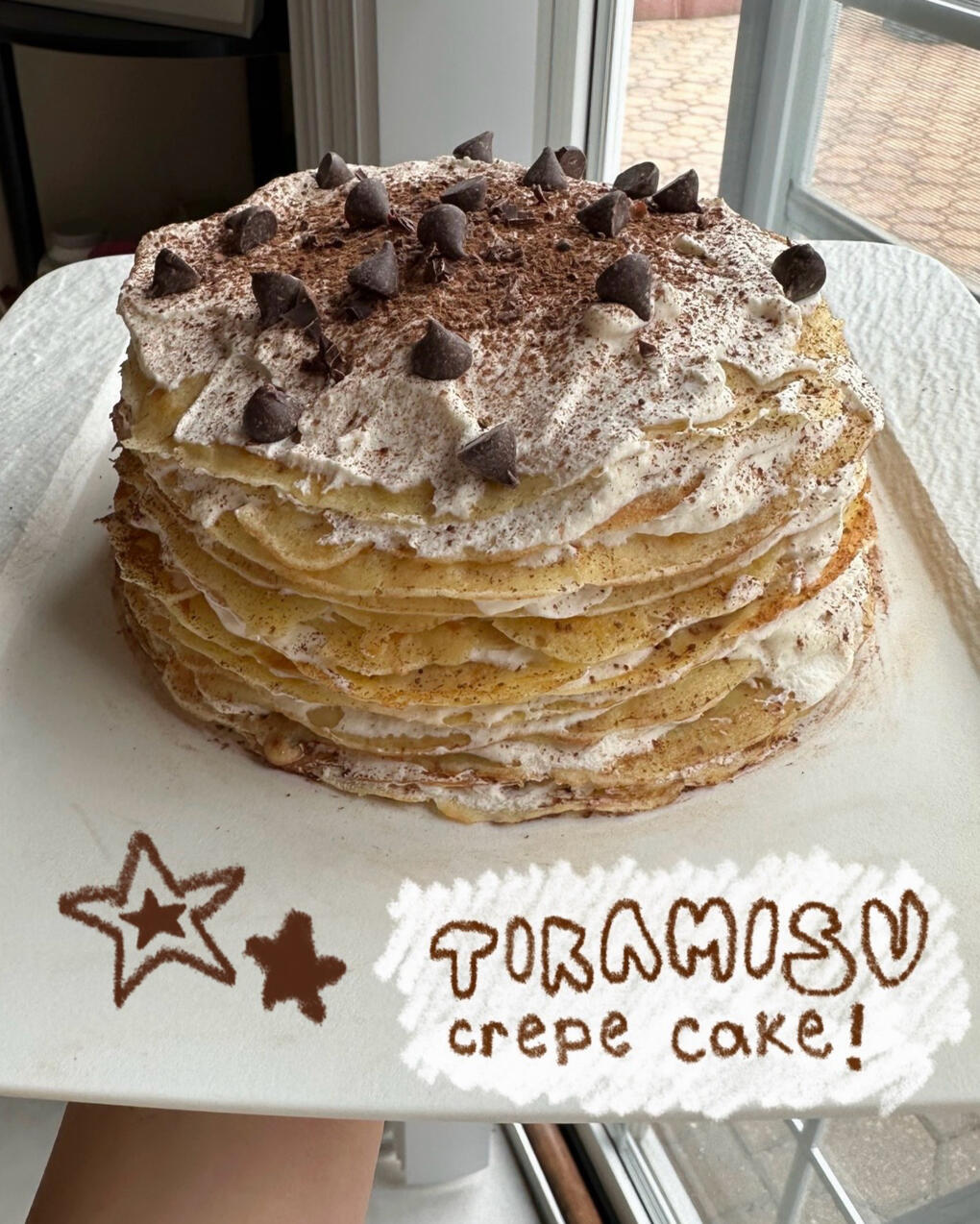 once done, for assembly generously spread 2 tablespoons of the mascarpone filling in between each crepe and dust with cocoa powder. repeat until all crepes are used and enjoy!