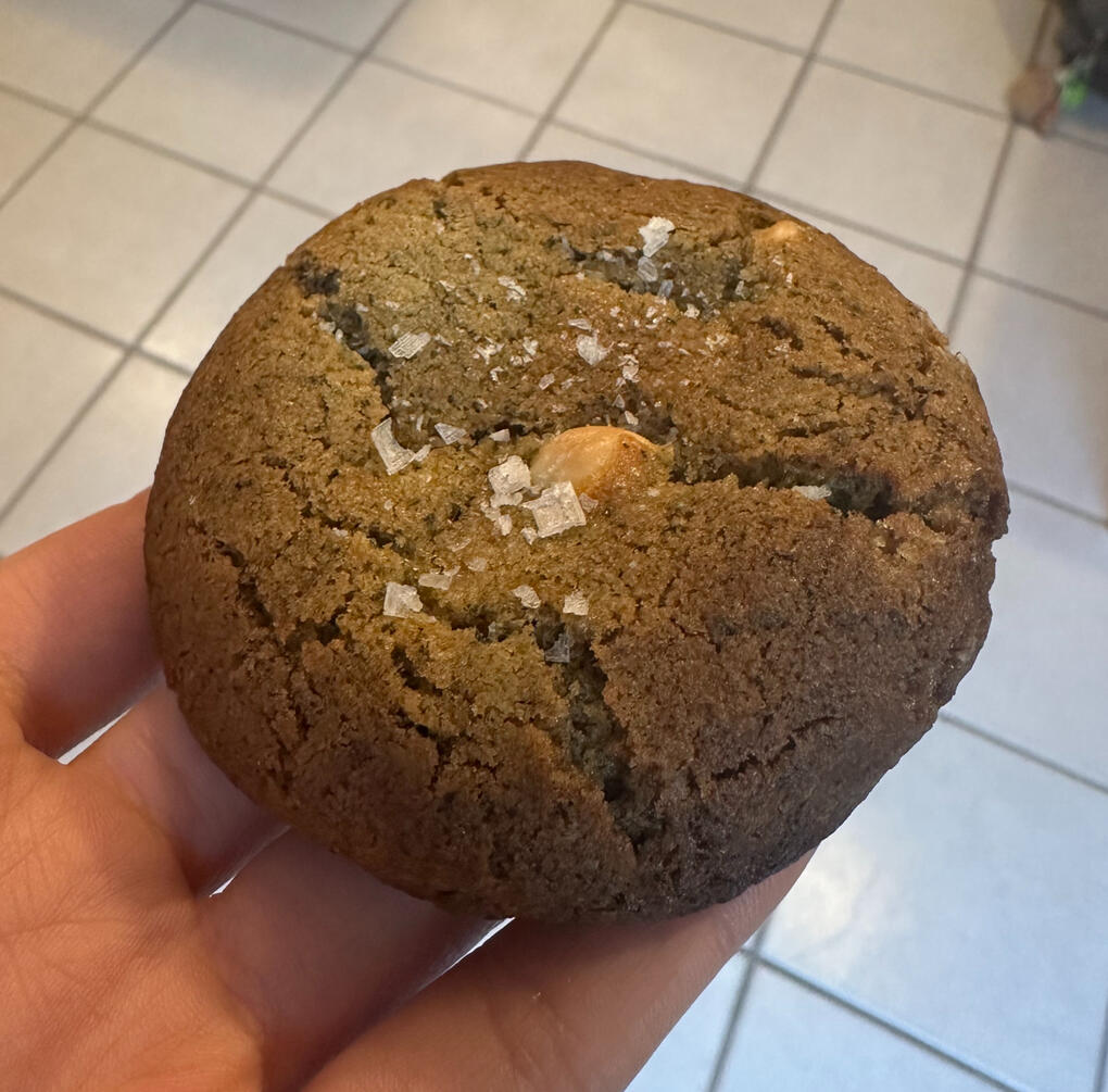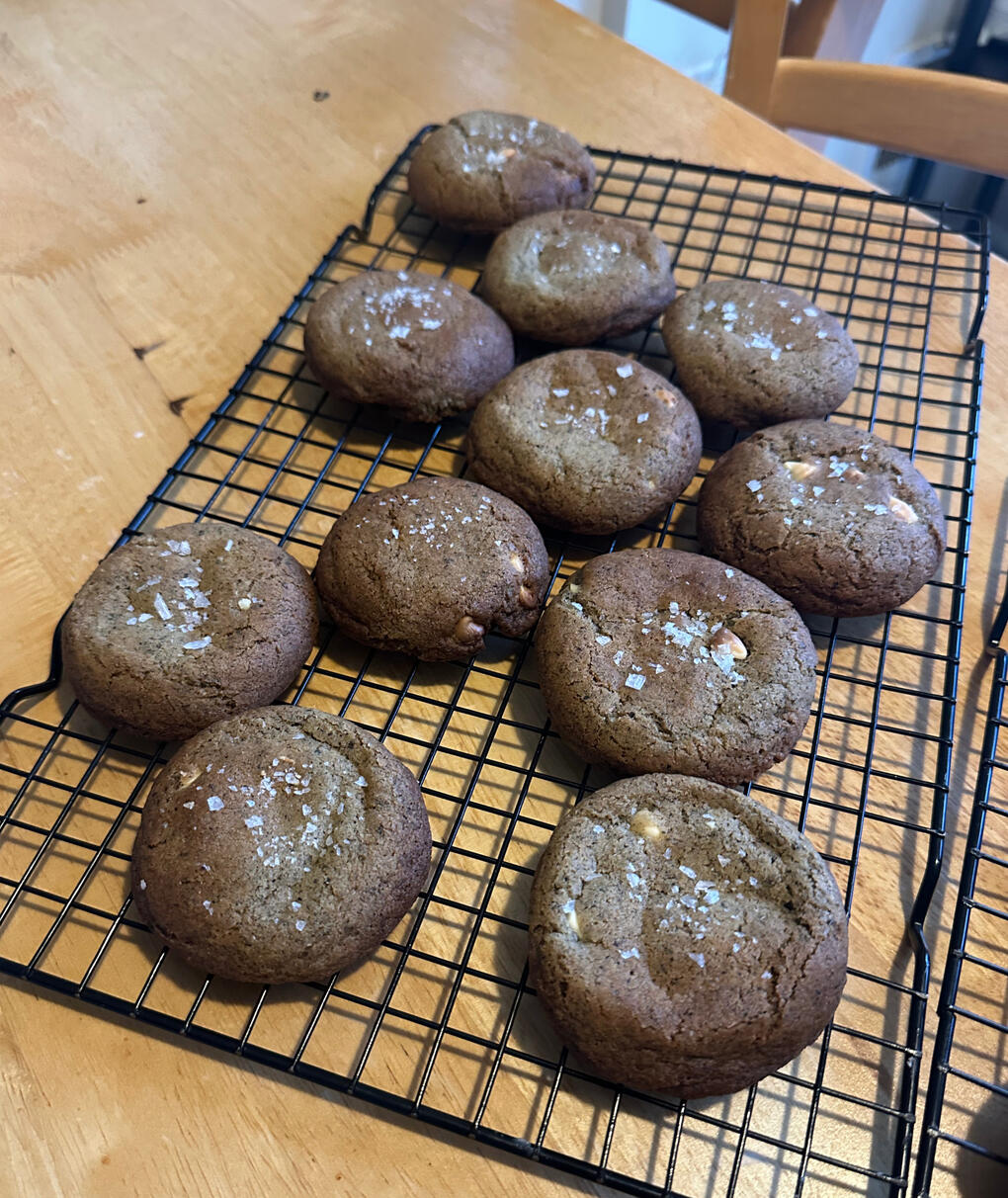 1/2 cup white chocolate chipsfirst brown your butter, stirring continuously, until that iconic nutty aroma surrounds you. mix together all the dry ingredients. once your brown butter has cooled, combine it with the sugars, then mix in the rest of the wet ingredients. gradually incorporate the dry ingredients (i do 1/3 a time) until there are no flour streaks. add the white chocolate chips and then chill in the fridge for at least 30 minutes. bake at 350 degrees for 10-14 minutes and once done, sprinkle flaky sea salt. make sure to keep an eye on them as the grey color can deceive you from seeing them burning!!
