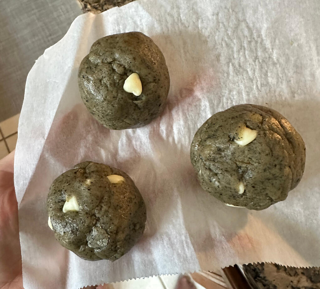 making these was one of the biggest impulse decisions ive ever acted upon on a school night but i'm not complaining. like the name suggests, black sesame is a variety of sesame seeds with a strong, nutty flavor profile and also a slight earthiness. fun fact, regularly eating black sesame seeds help decrease high cholesterol and triglycerides which are risk factors for heart disease. i did in fact begin obsessively consuming black sesame products to help with my balding because sesame apparently nourishes your hair roots with its omega fatty acids, triggering hair growth?? anyways that's all to say that these cookies will not disappoint especially with their pockets of melty white chocolate.