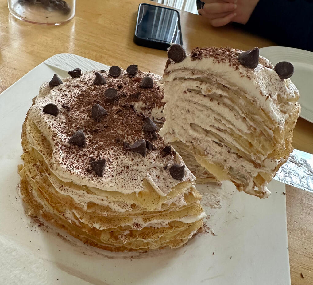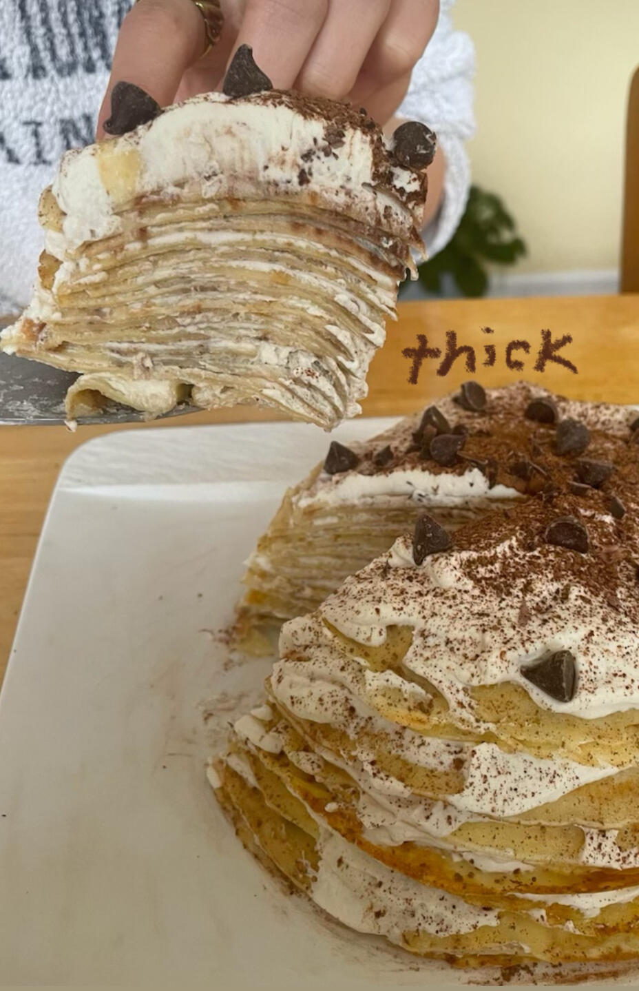 once done, for assembly generously spread 2 tablespoons of the mascarpone filling in between each crepe and dust with cocoa powder. repeat until all crepes are used and enjoy!
